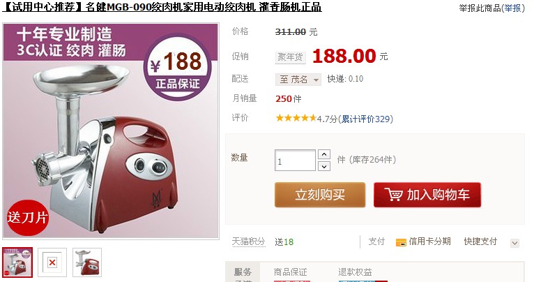 两面针客房易耗品茂名总代理 酒店客房易耗品专家 注册 2009-03-24 消息 1,904 反馈评分 0 点数 0 2013-01-23 #20 QUOTE(酒圣 @ 2013年01月23日 Wednesday, 12:22 PM) 绞肉机,准备买这个 [snapback]3487607[/snapback] 贵了点 我介绍你买这个人的 http://item.taobao.com/item.htm?id=14068889477