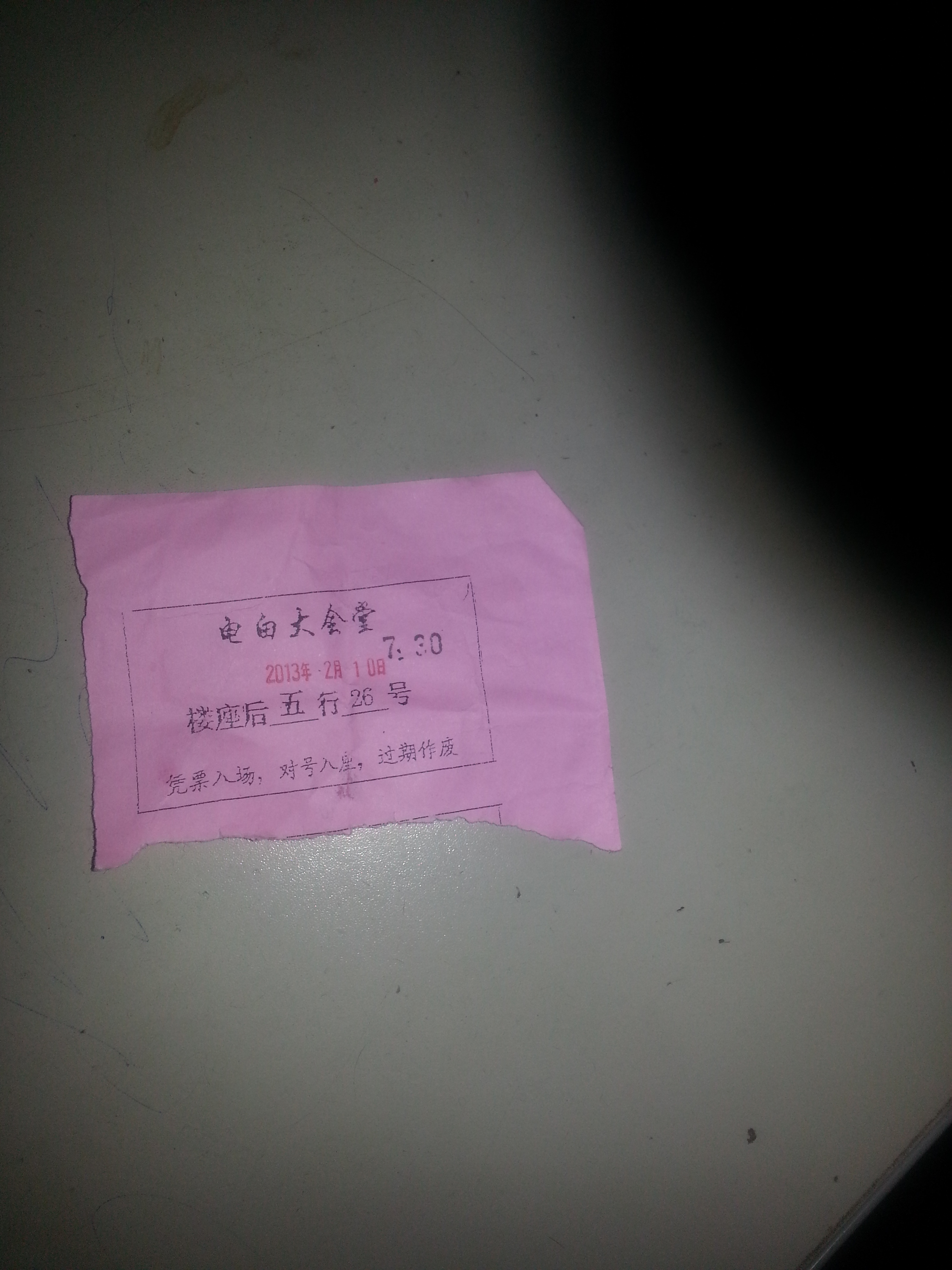大约20分钟本人再回到会堂,只见前面门口洞开,所有观众都进入里面,门口多了不少公安和武警的身影。于是本人也赶紧走进去,但听说要凭票入座,于是折回大厅发票窗口处,见到零星几个人在排队,但里面不见工作人员。又有说,刚刚发了票,发了一会儿说没票了。于是我重新走入会堂,找一个空位坐下。不久,文化局一位官员命令公安和武警清场,要求没有戏票的立即退场。当时我想,清场可以,但动用公安和武警,这岂不是滥用国家公器,而且只是政府一个小小的官员。