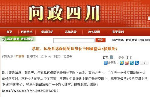 网友称,王刚(40岁,有妇之夫)前几天中午去一女性家里,与该女人偷情正欢时,不料女人的男人中午回家,王慌忙中只好跳上窗口躲在空调上,结果不慎摔下当即身亡。 1日15时许,岳池县人民政府新闻办公室给四川日报网发来回复:2013年2月22日13时许,岳池县环保局纪检组长王刚在九龙镇大东街51号三幢一单元三楼意外坠楼,到县医院抢救无效于下午5时左右死亡。(四川日报网)