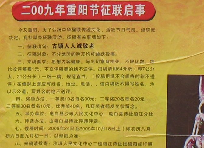 2 225522 . 荣誉会员 注册 2008-09-07 帖子 9,363 反馈评分 89 点数 71 年龄 15 2013-03-07 #15 QUOTE(汪洋大海 @ 2013年03月07日 Thursday, 01:44 PM) 楼主此出句是沙琅去年重阳节征联出句的改版:喜庆重阳诚敬老 我当时获得一等奖的对句是:坚持百日共维新 [snapback]3508040[/snapback] 附件 IMG_2177.jpg 74.6 KB · 查看: 248 IMG_2178.jpg 78 KB · 查看: 268