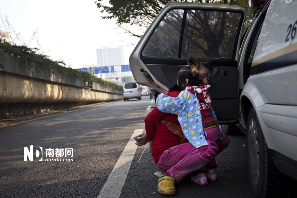 冲突发生后,女小贩的孩子惊恐地抱着她的妈妈。 南都记者 黎湛均 摄