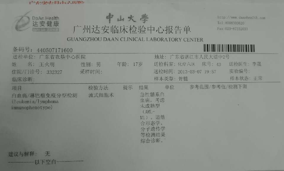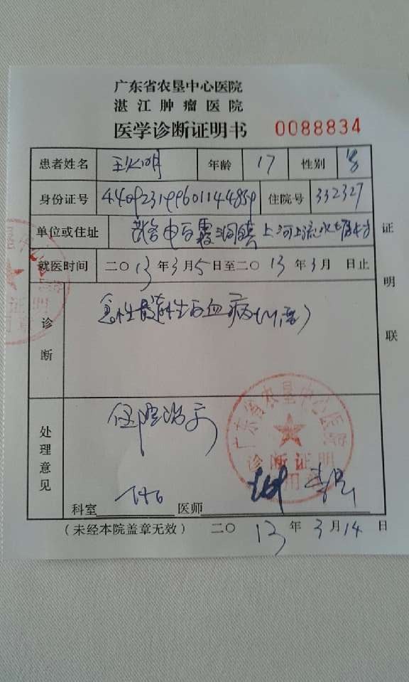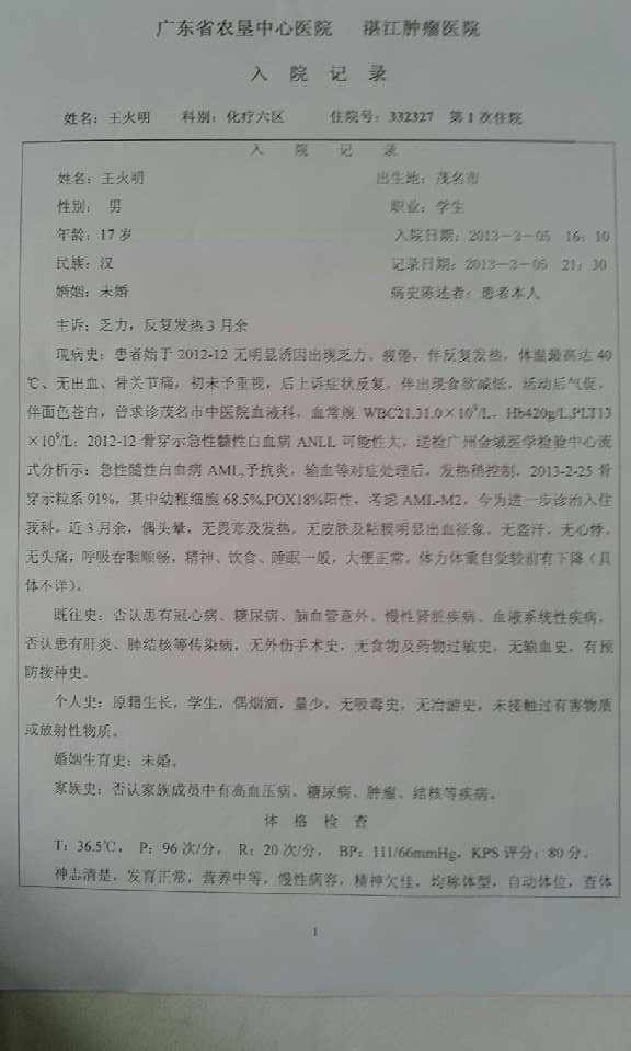 患者姓名:王火明 男 17岁 电白霞洞镇上河流水塘村6号 患急性白血病(白血病M1)