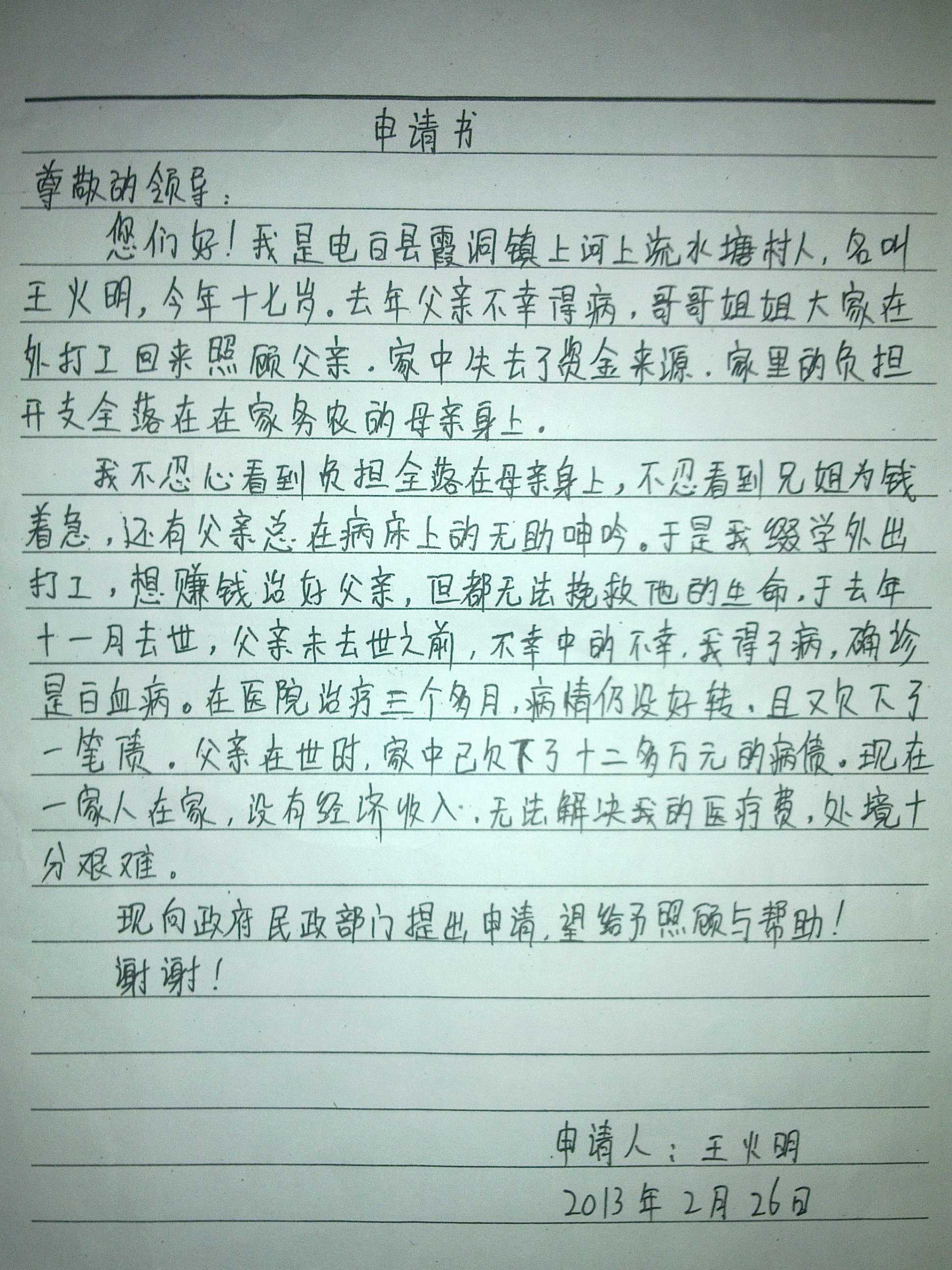 王火明一家五人,父母均靠做水泥工为生,去年其父亲生病后欠下一大笔医疗费用,其父亲最终也因为救治不及时而病逝。为帮其母亲减轻负担,火明跟他的姐姐都辍学外出打工。而更加不幸的是火明外出打工不久也因为身体不适而检查出患上白血病,这一消息无疑给其家里雪上加霜!住院后因为家里实在拿不出那么多钱,即使医生不断追问其家人要不要化疗,其家人都不敢答应,希望社会各界仁人志士能伸出您的援助之手,帮帮这刚失去父亲,又遭遇不幸的青少年吧!