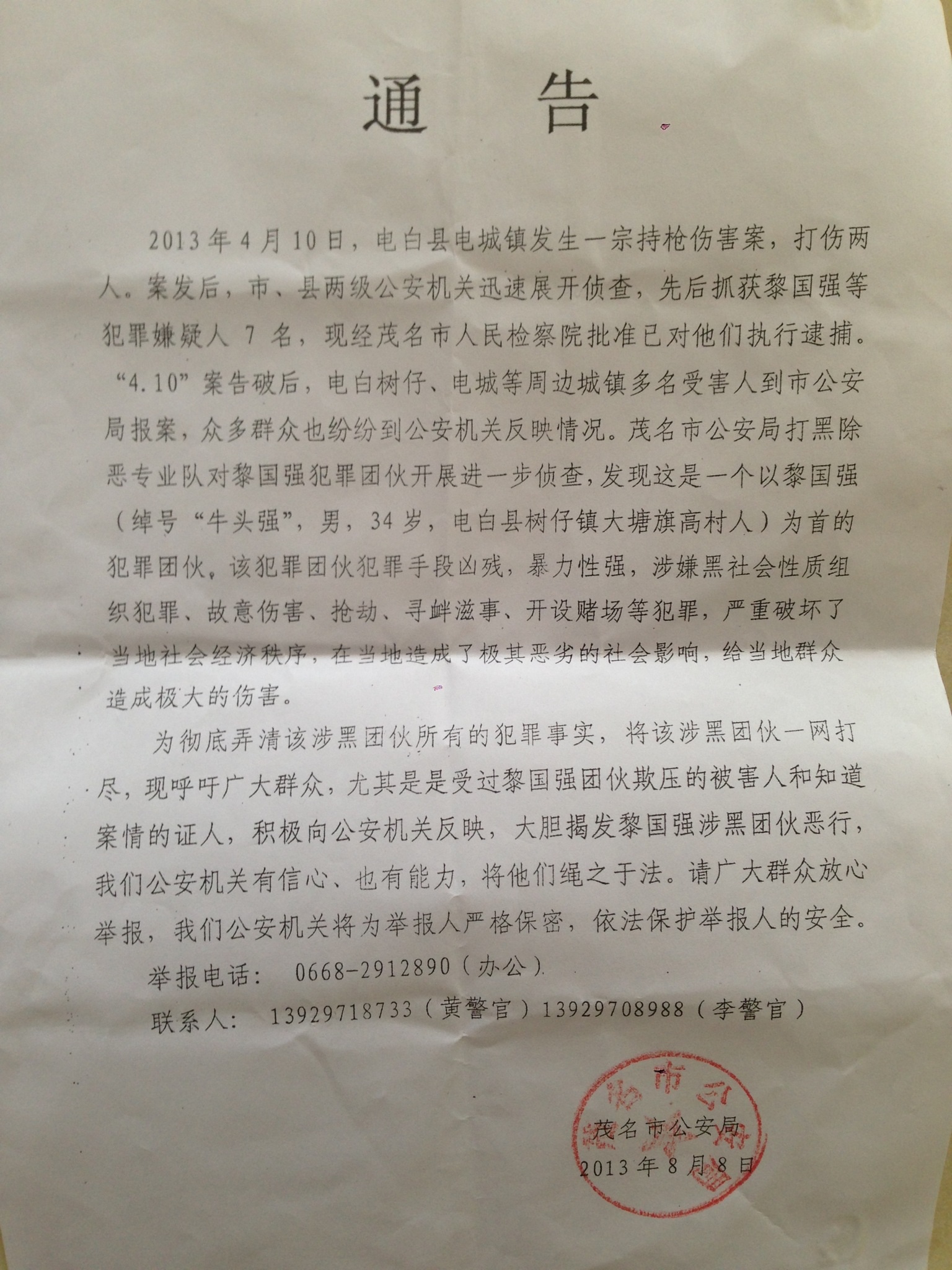 一个作案累累,且涉及人命案,通缉犯黎国强被通缉七年,却能逍遥法外,尽管2007年曾有落网一回,但很快就被人捞出去,能够把通缉犯捞出去,能够把通缉犯“案底洗白”,非一般人所为;且庇护其继续在电白作威作恶,开设赌场,放高利贷,垄断电白沿海三镇煤气交易,继续犯案伤害良民百姓,其保护伞更不是一般人!曾有街坊传言,黎国强的后台老板为了帮黎国强“洗白”,曾为其花费了数百万元,难道这一切都是真的!那么,通缉犯黎国强背后是谁呢?希望有正义的上级领导、媒体记者、公民关注,共同协力为我们这些受害者讨一个公道!这样,电白涉枪案才会减少,电白人民才能安居乐业!