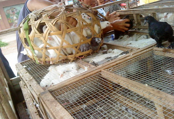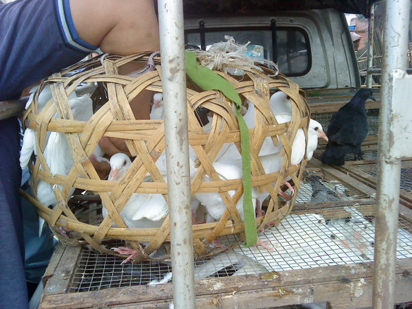 路见一辆四轮简易车装载着一车白黑鸽一路叫买,引来很多人光顾购买,有些人说太贵了,说那里那里十元钱三个?弱问句大伙都不怕现在流行的什么感吗?