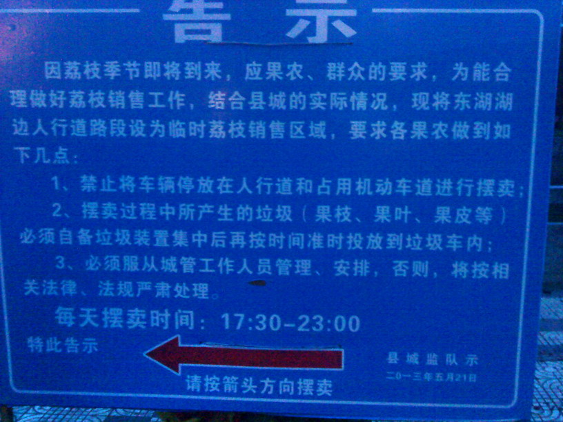 按告示:此举有关方做的还算可以,还算有点滴人性化?只是有"个别"商贩真的不敢恭维。