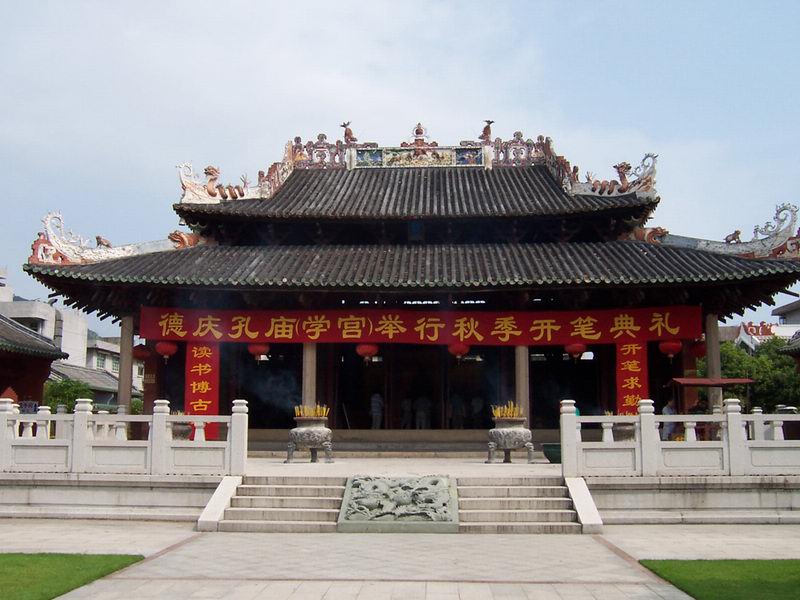 更主要的是,德庆是龙母故乡,又有著名的孔庙。求学读书之人到德庆,基本都要去孔庙上柱香,德庆孔庙始建于北宋大中祥符四年(公元1011年),重建于元大德元年(公元1297年),整个庙以南北为中轴,分左、中、右三路建筑群,可以说是集殿、坛、阁、祠、庑(也就是廊)以及池、桥等各式建筑于一身,现在整个景区主要由棂星门、大成殿、名宦祠和乡贤祠、尊圣义祠、东西两庑、尊经阁、仰圣园等组成,占地面积一万平方米,建筑面积将近五千平方米。其中大成殿和仰圣园更是特色显著,被誉为我们孔庙的两岸大镇庙之宝。
