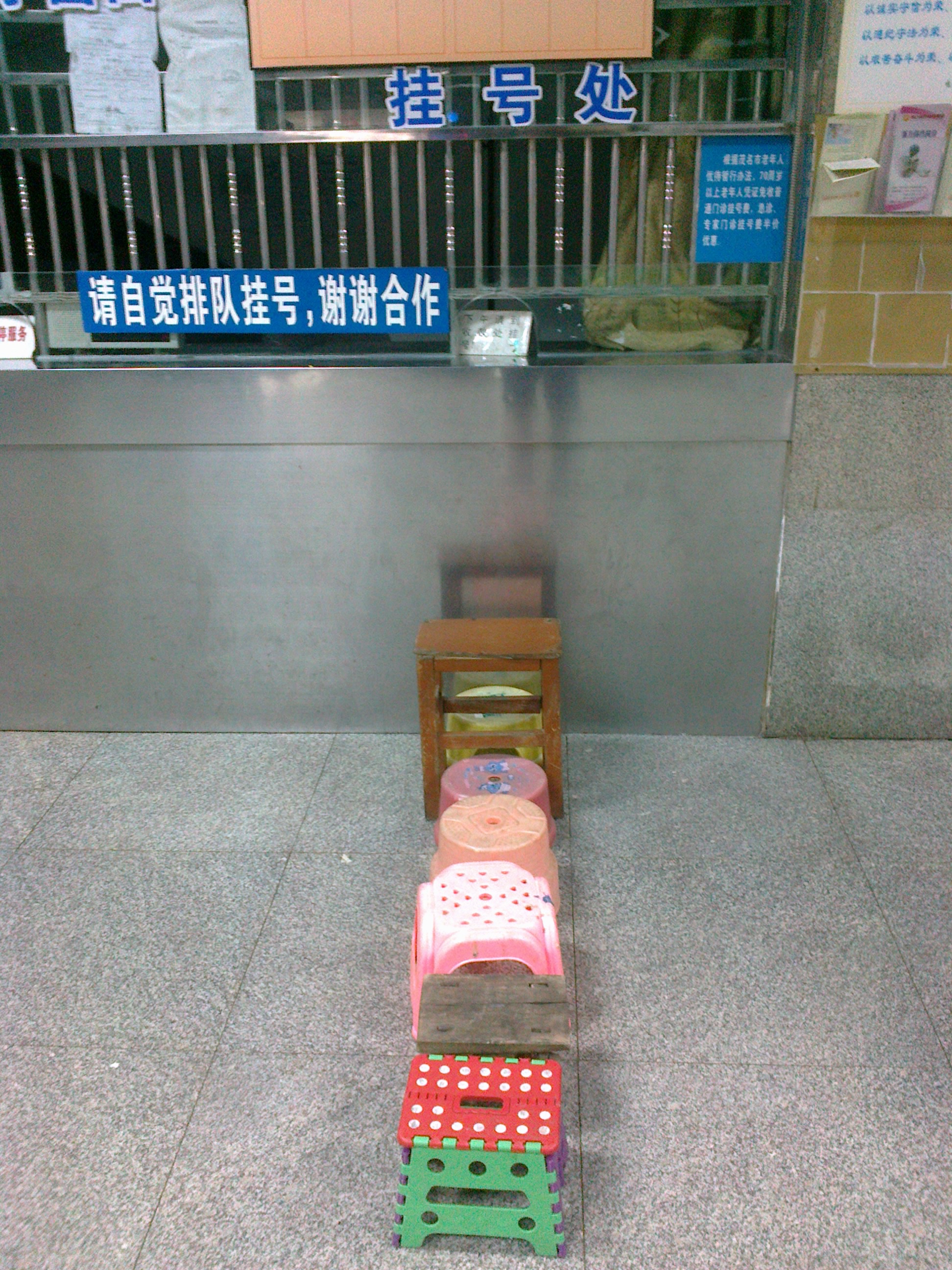 怎么说呢?在我的面前,一字开排着八张大小不一的凳子,这八张凳子上都没有人!乖乖不得了,既然凳子上坐着的不是人,那就一定是鬼了!哇呀,跟鬼一起排队挂号,心里真他娘的是凉嗖嗖的!