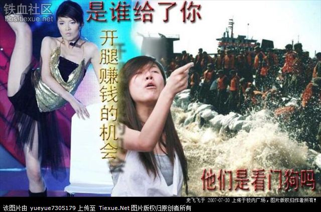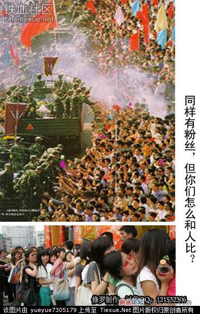记得06年有个不要脸的超女唐笑,因为有个当兵的在执勤,她没有出入证,当兵的不让她进,她骂当兵的是看门狗,还打当兵的?被推了一下还仗着自己幼小,有粉丝,硬说当兵的打他了,还要道歉,**你大爷了,还有王法吗?还有法律吗?我们站岗值勤为的是谁啊?不都是为了保卫你们的人身安全吗?真要是有个捣蛋的混进去还不把你们给办了啊?你还是人吗?难怪你不能夺冠,就你这素质,三里屯酒吧都不要你,你怎么跟08年的张雅似得呢? 看不起别人之前,先看看自己有没有那资格………在看不起当兵的之前,先问问如果让自己做那么大的牺牲,你办得到吗? 所以…你有什么资格看不起当兵的???????