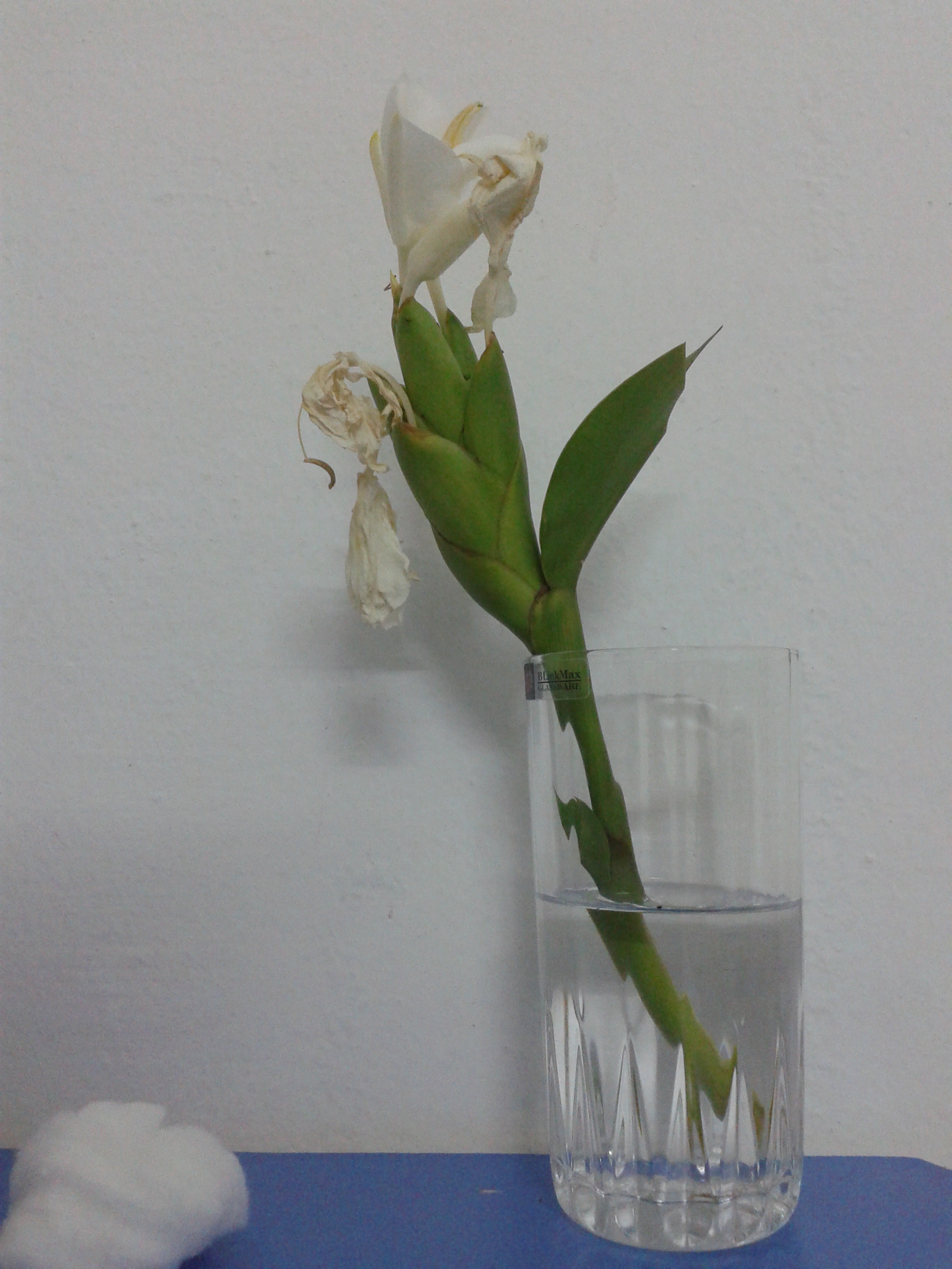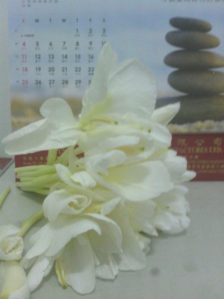 去菜市场,路边花农阿姨在收剪花送去花店,回来的时候阿姨不在了,只留下了几朵零星的落花裸露在杂枝旁,白切如玉,让人犹怜,大概是这些已经开了,所以被丢弃了,捡回来了,满屋子的花香,却不知道这花的名字。