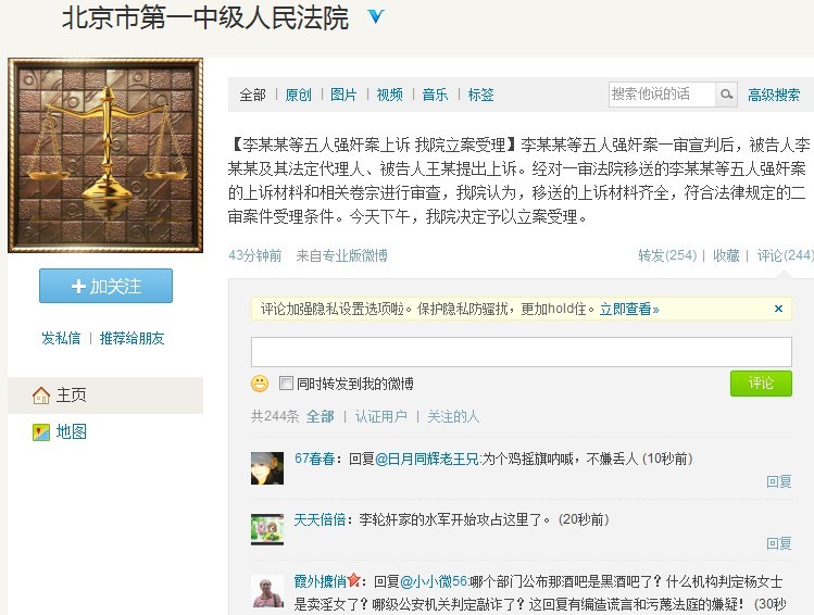 法院官方微博发布消息证实李某某案上诉。
