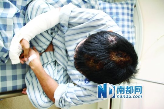 在当地医院进行了简单包扎后,阿杰被工厂老板接回了顺德和平外科医院进行手术。昨日在医院,手术后的阿杰头部还可明显看出3个伤口,他被诊断为轻微脑震荡,头部、双手共缝针超过40针,右手两处筋腱断裂。