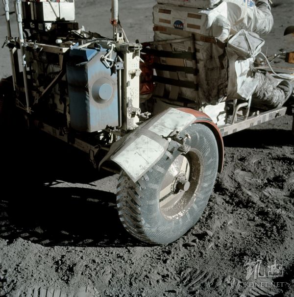 这是阿波罗登月车的轮胎近景,轮毂是铝合金的,轮胎由镀锌钢丝编织而成。70年代这件复制品一直在美国华盛顿的宇航博物馆里公开展出。