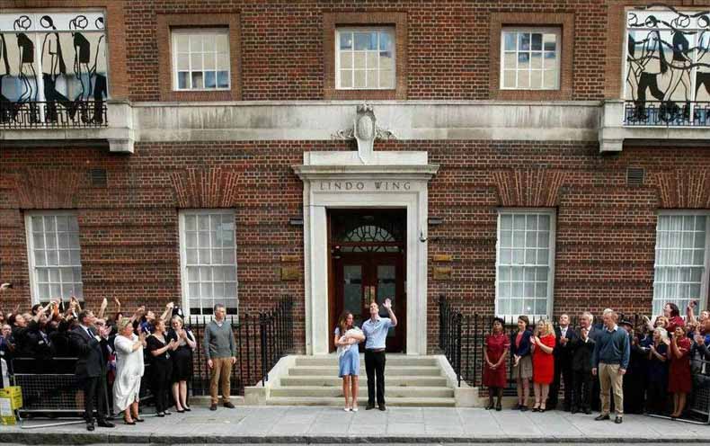 7月23日,英国,凯特王妃与威廉王子抱着英国皇室的新生儿走出医院,向围观的群众和媒体打招呼。7月22日下午4时,英国凯特王妃在英国伦敦顺产诞下小王子,重3.8公斤。