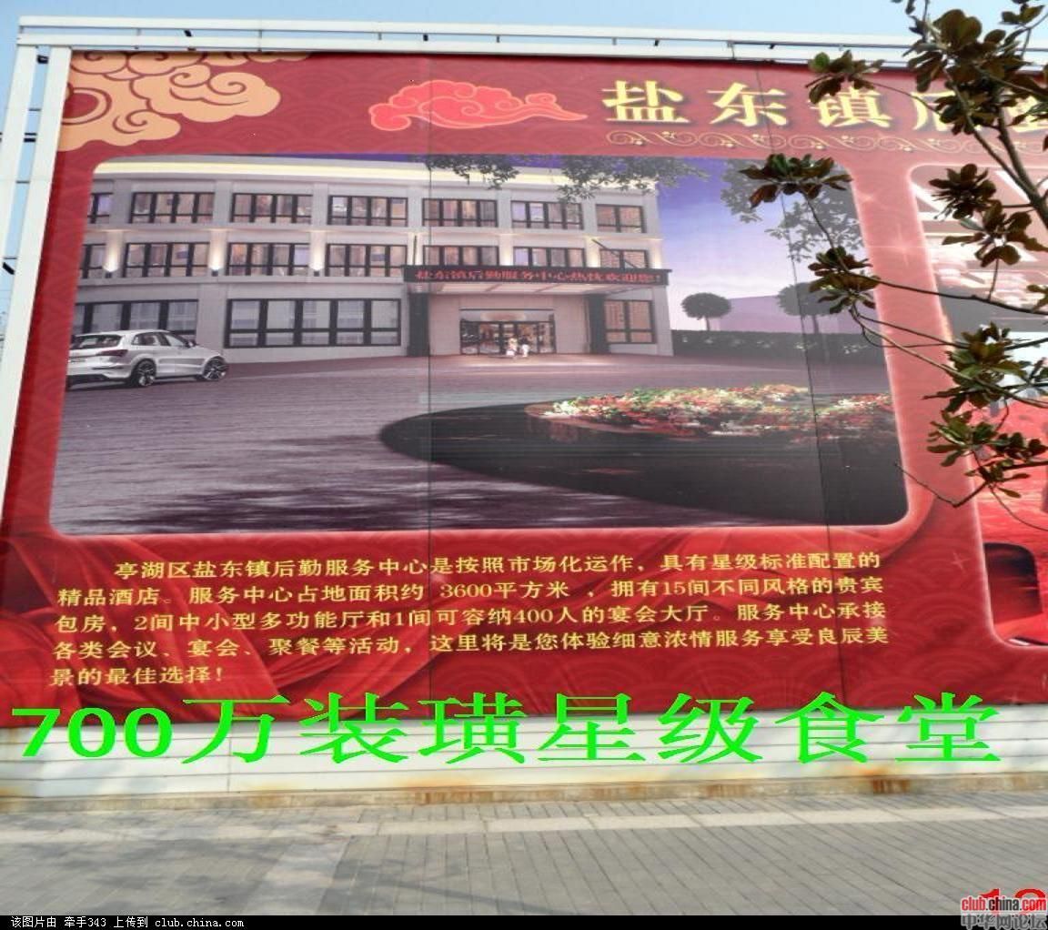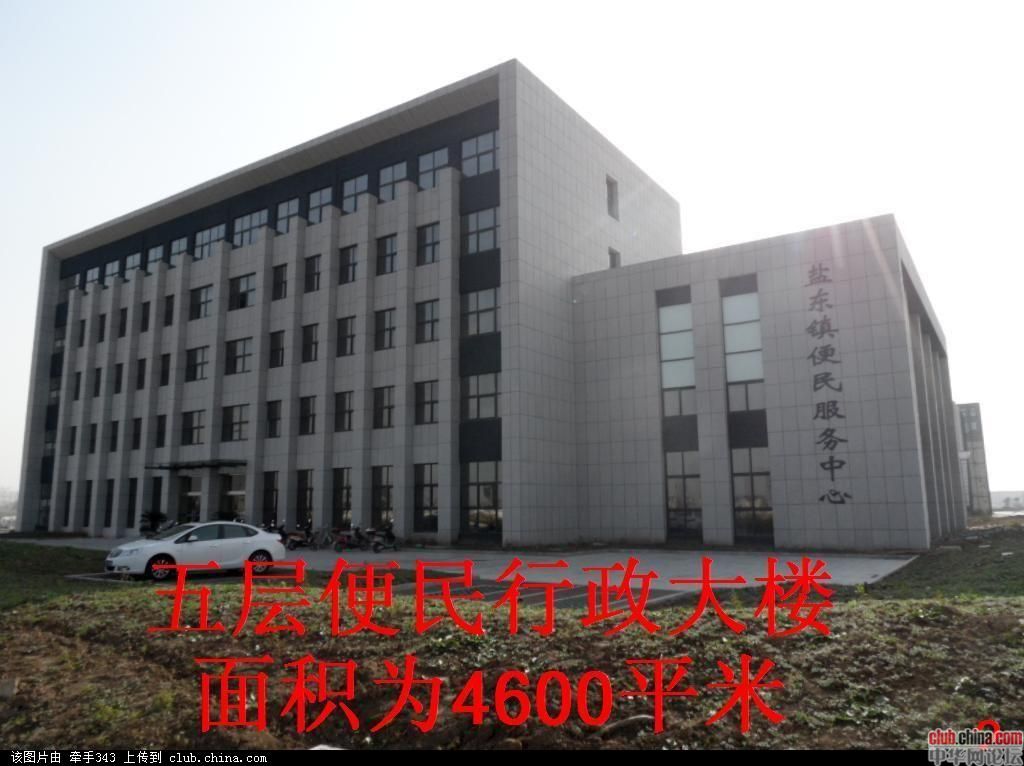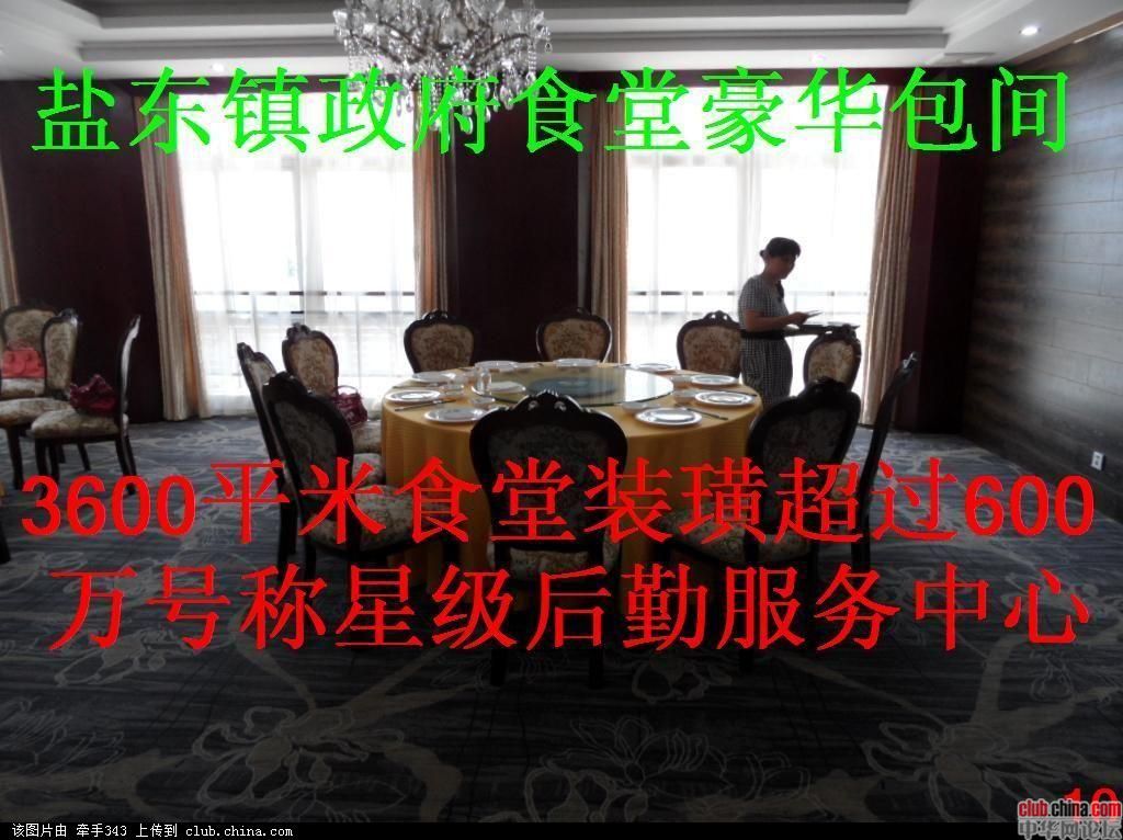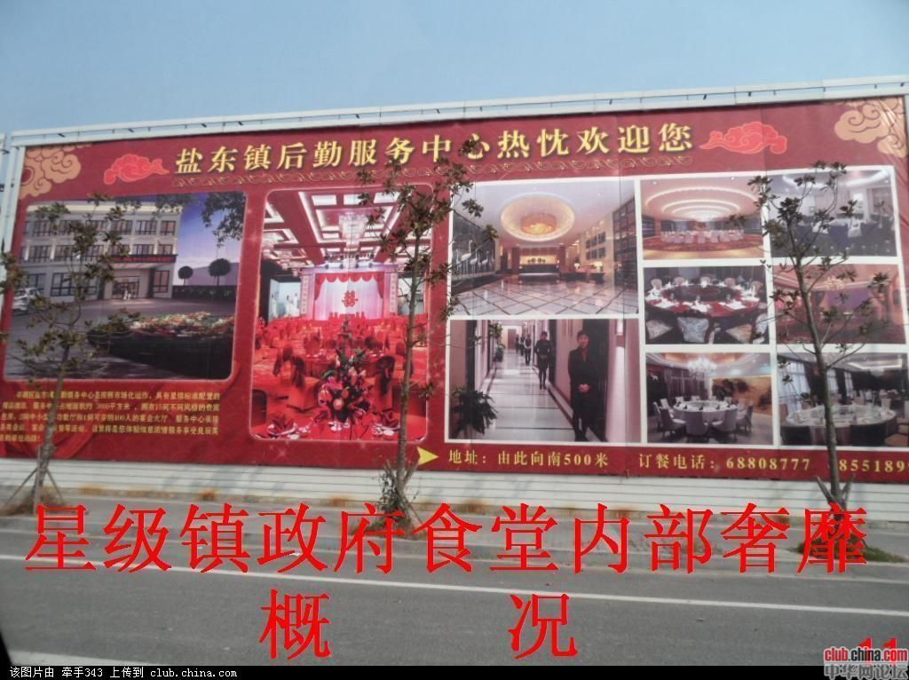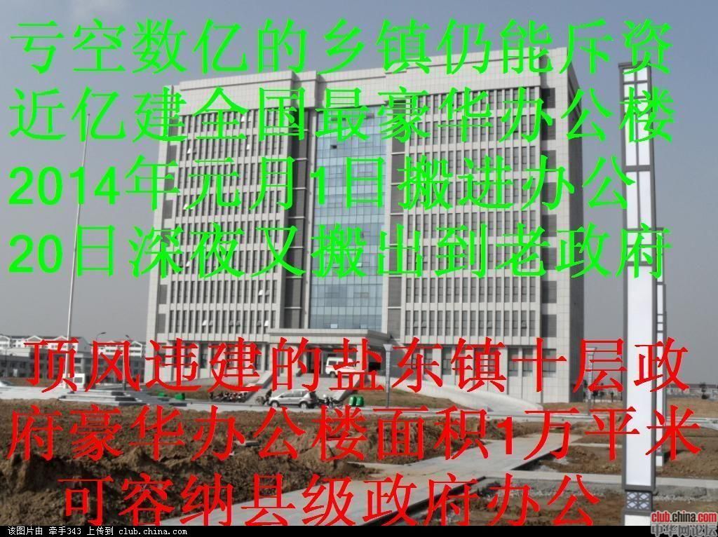 江苏省盐城市盐东镇占用农田150亩,斥资3.2亿元新建十层10000平米政府豪华办公楼一幢、五层4600平米综合执法楼一幢、三层3600平米星级后勤服务中心(政府食堂)一幢、四层3800平米官员宿舍楼一幢,绿化、广场、假山、喷泉、河宾观景台俱全。无论从建筑的规模,还是到内部装璜配置,都称得上全国最大最豪华的乡镇级政府大楼。但2007年至今七年间盐东镇负债近十亿元。