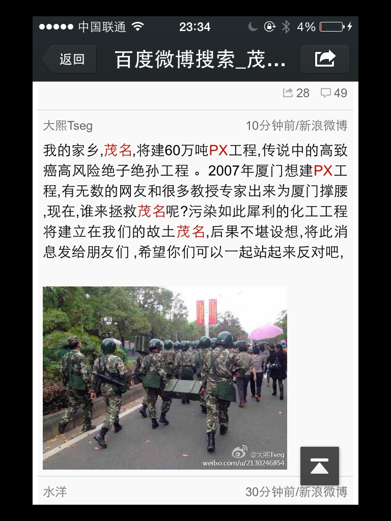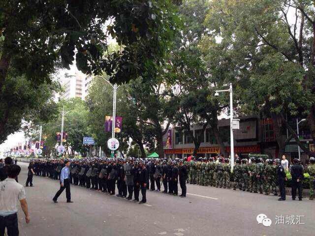 转发:事情再升级,今晚化州,高州,信宜的武警都会下来,今晚十二点开始大封闭,大家要注意安全!茂名人不要用命去硬来。现在的茂名就像关起大门,所有信息被封锁了。事情发展到烧警车,推翻政府车,防暴警见人就打就抓,听说已死亡两人,茂名人挺住!政府不把消息外露。今夜记挂着游行的勇敢市民,睡不着。