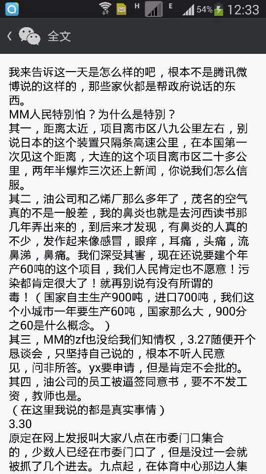 我前两晚有个宴席,可能有人以为我在瞎掰,但事实就如此,照片就不上传了,那是内部同学的聚会,就在游行之前两晚。阿乌这一场酒宴也比较诡异,同桌的老同学竟然有一个化学材料专业人士,甚至可以称为专家,几个茂名市区的生意人,有一个本地环保部门的小官员,还有一个就是警察。警察说今晚就不喝酒了,要待命,因为有任务在身,茂名明天将会有大规模游行,不知道怎么发展,别出事就好。那些茂名土著无不义愤填膺,要给下一代一个交代,一个好的环境。我私下问过那个学化学材料专业人士(博士级别,跑过很多国家),二甲苯项目真的如此不堪么?他的回答是其实这东西本身低毒,但生产的衍生物还是有较强毒性的,在国外这种工厂很多,关键是经济效益确实可观。而国外的选址和本地居民的利益往往捆绑在一起,很多工人就是本土化,解决当地就业民生问题,而且环保具体的措施执行监管极为严格,可媲美核电。至于在中国,你根本不知道生产之后会发生什么,这是令人担忧之处。
