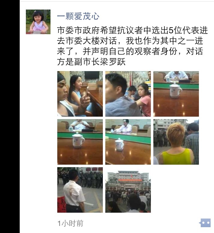 抗议行动持续到第三日,茂名市委门前今天下午仍有大批民众聚集抗议,油城路大草坪路段东西向被封锁,从网友转发过来的记录显示,市委市政府现场从抗议者中选出5位代表进去市委大楼对话,茂名在线负责人也作为其中之一进去,并声明自己属观察者身份,对话方是副市长梁罗跃
