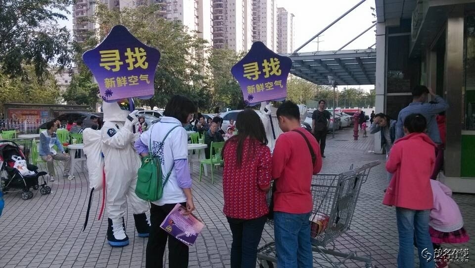 今天,茂名市区人人乐、明湖、沃尔玛和水东中心台等商圈惊现“太空人”,他们身穿白色航天服、头戴航天盔、背挂航天包,手举着“寻找新鲜空气”的牌子,吸引众多市民围观。据了解,这是碧桂园城市花园首次举办“寻找新鲜空气”的大型环保公益活动,旨在呼吁提高人类的环保意识。