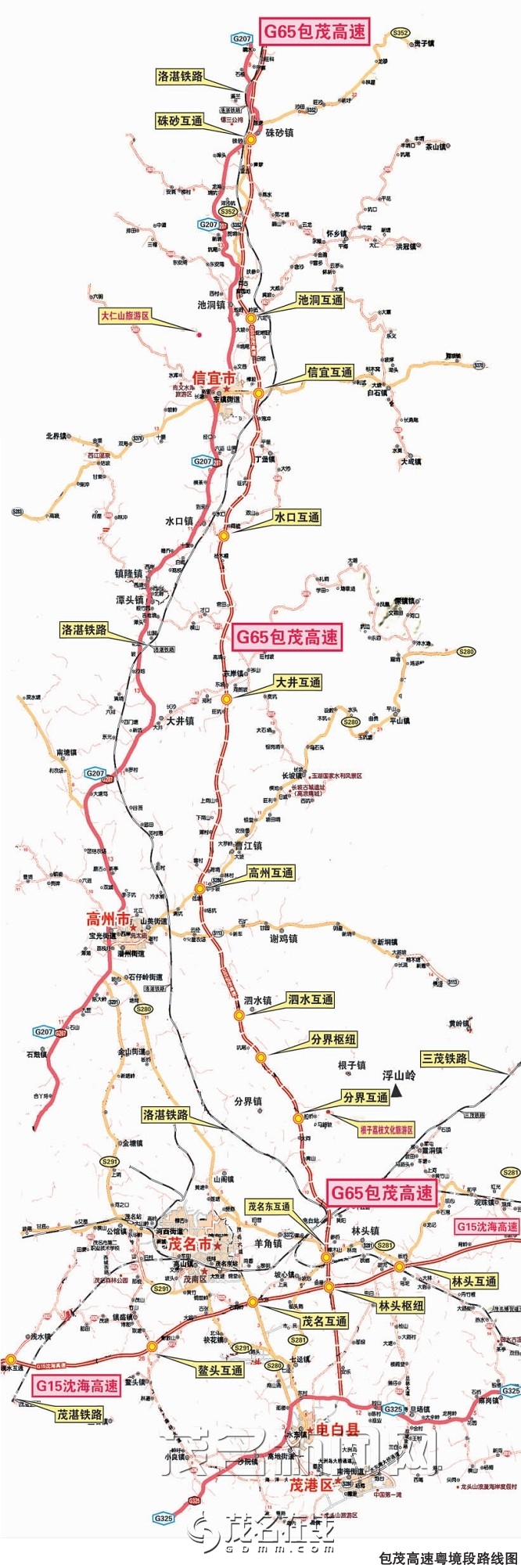 包茂高速公路粤境段主线全长122.322公里,互通立交连接线7条共19.237公里,全部在我市境内,起于信宜市粤桂交界处的陈金顶,往南经信宜市6个镇(朱砂镇、池洞镇、怀乡镇、东镇街道、丁堡镇、水口镇),高州市6个镇(东岸镇、曹江镇、谢鸡镇、泗水镇、分界镇、根子镇),茂南区1 个镇(山阁镇),茂港区2个镇(羊角镇、坡心镇),电白县3个镇(水东镇、霞洞镇、林头镇),高新区1 个镇(七迳镇)共19个镇。