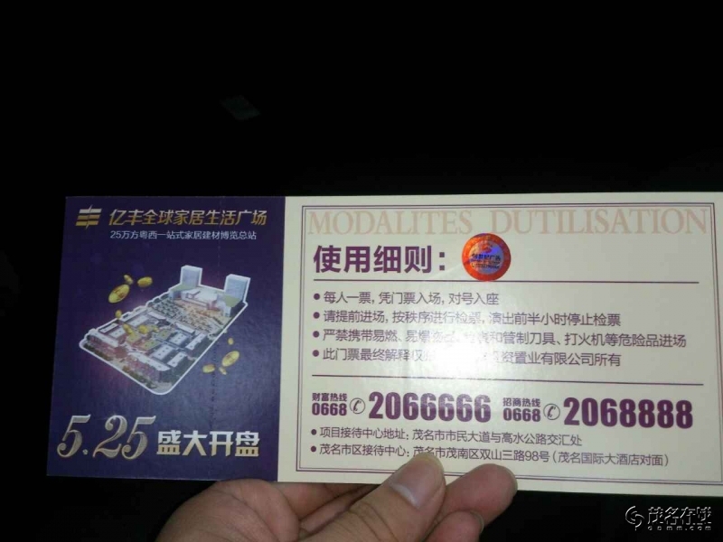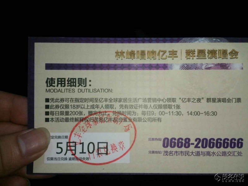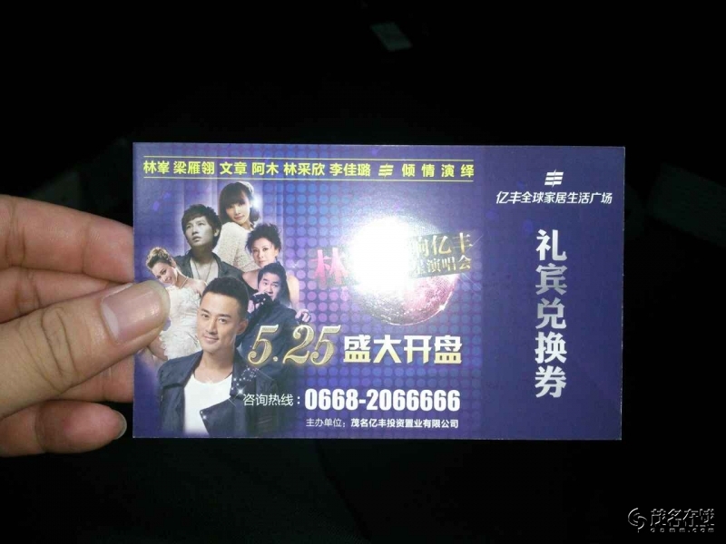 门票兑换券若干张,现价:300一张(需限5月10号自行到茂名亿丰营销中心兑换。)