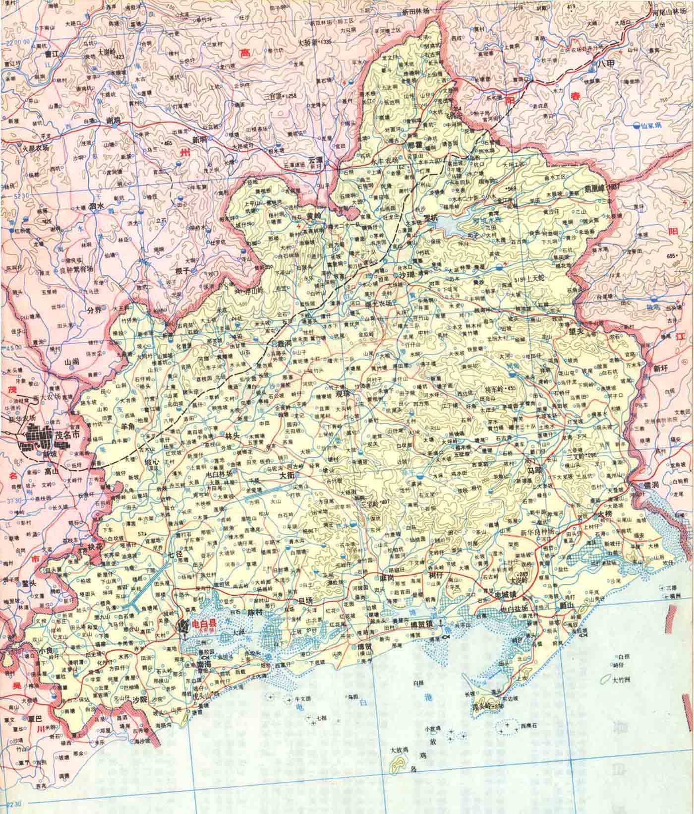 这样看,茂名就偏倚一角落啦,当年茂名把电白拆分,电白县城在一包围角落,现在电白包围茂名