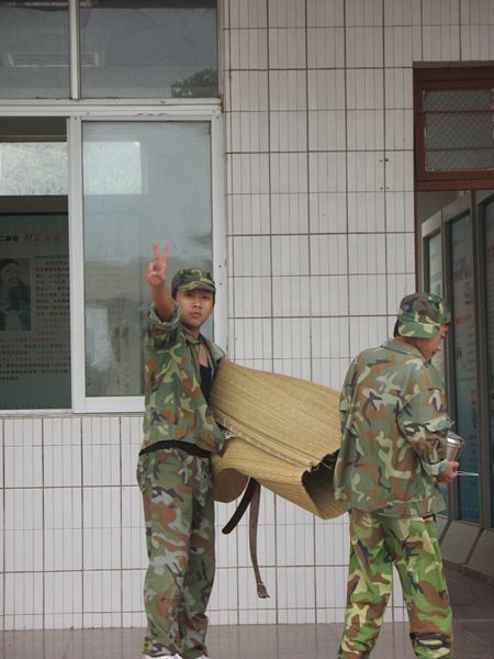 说实话,刚去的时候很不习惯。只要教官的哨子一响,不管你正在干什么,都要立刻从五楼的宿舍飞奔到楼下的广场集合。所以,第一天的早晨,齐刷刷地一群人“衣冠不整”的站在那,排队也如斗折蛇行一般。教官的脸色一黑,眉头一皱,一声令喝:站好。我们立刻运起了江湖上失传已久的武林绝学“乾坤大挪移”迅速地对齐,接着每个人都身成了木偶,一动也不敢动。再接着,就是头顶着火辣辣的太阳脚踩着滚烫滚烫的水泥板的训练时光了。
