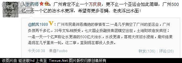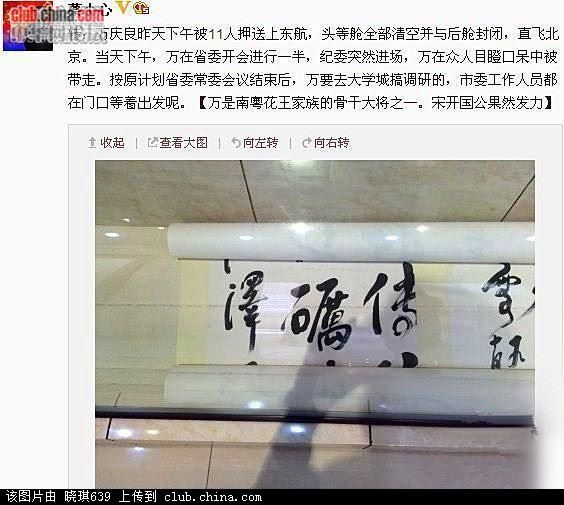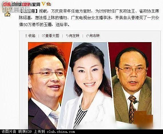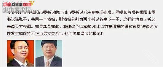 广州市委书记万庆良突然倒台,震撼广东官场。知情者近日纷在微信及网上爆内幕,指万涉巨贪之余,还与去年底落马的揭阳市委书记陈弘平同享情妇,该情妇更分别为他们各生一子,并由万安排在广州隐居抚养;为回报情妇,万、陈两人利用权力为她和家人谋私,包揽工程等,令情妇家族富甲一方。学者批官场衣冠禽兽,讥万庆良创下荒淫无度新纪录。
