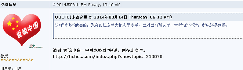 QUOTE(dflcq @ 2014年08月11日 Monday, 01:09 AM) 关公门前舞关刀,玄海贴里讲风水!兄台你有种,不知你跟玄海大师比谁的功力更高呢? [snapback]3684824[/snapback] 应该彼此彼此不分上下,电白一中校长可以找找这个高人请教。