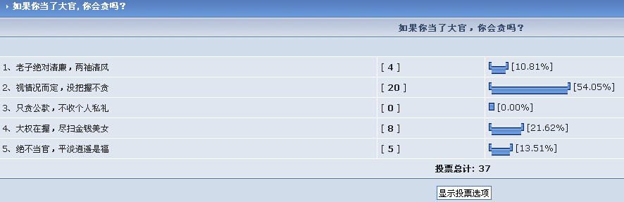 QUOTE(山里人家 @ 2014年08月16日 Saturday, 10:11 AM) 应该不止二种人,林子大了什么鸟都会有才对。 [snapback]3687410[/snapback] 多数属于这种人!75.67%! [attachmentid=331320]