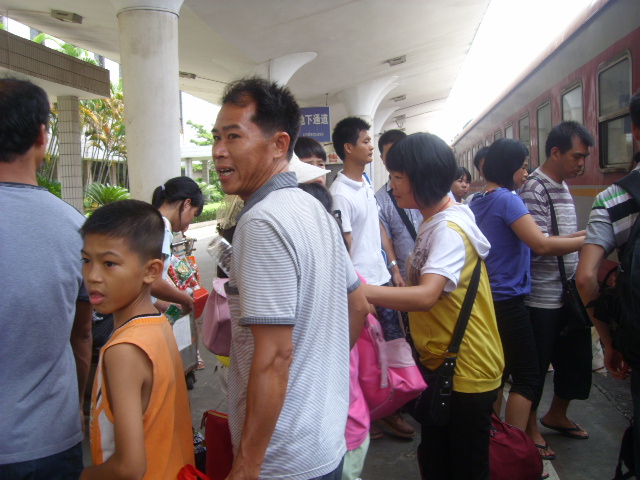 火车……人流……我想焦点应该放在前面两父子身上……你说象假期出游……但又没有行理…… ……信息太少……找不出主题……