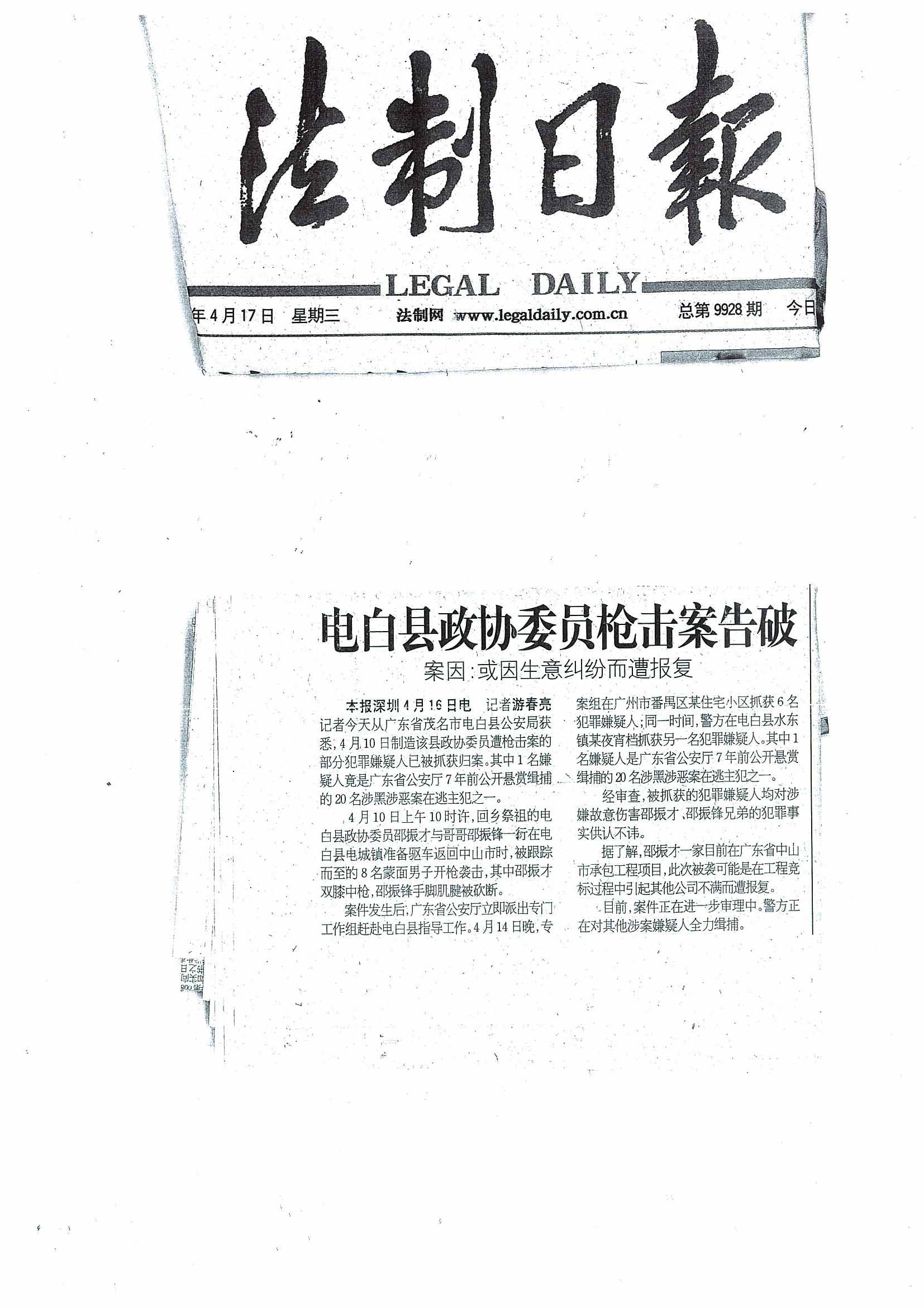据知情人透漏:因去年持枪招摇过市,跟踪10里,蒙面残忍地在电白电城镇制造“410”枪击刀砍政协委员邵振才,邵振锋兄弟血案而东窗事发,轰动全国的茂名市有史以来最大黑社会“牛头强”黑社会组织20多名歹徒,今日将在茂名市中级人民法院开庭审理!