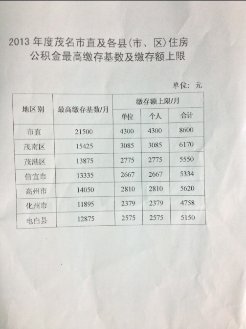 三、根据茂名市统计局提供的茂名市2013年市直及各区、县级市在岗职工人均工资数据,核定2014年度我市市直及各区、县级市在职职工住房公积金的月最高缴存基数分别为:市直22677元、茂南区17761元、电白区18515元、信宜市17716元、高州市16586元、化州市15968元。职工月平均工资总额未超过月最高缴存基数的,以实际月平均工资总额为缴存基数。
