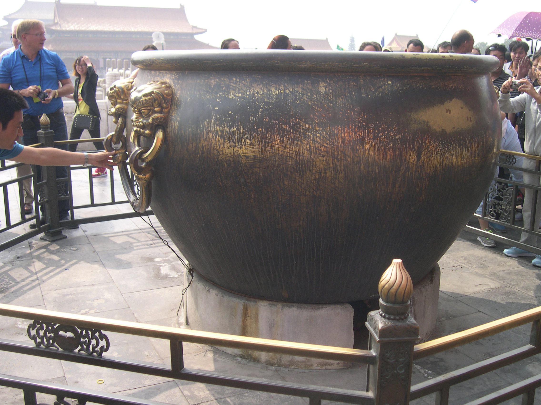 太和殿门前的铜铁缸,左右各一个。这种铜水缸是宫中的防火设备之一,平时贮满清水,以备灭火用。每到冬季至翌年二月,在缸外套上棉套,缸上加盖,气温低时,缸下烧炭加温,以防缸水冻结。这种消防用的水缸距今最早的为明代弘治年间(1488――1505年)铸造,缸两耳设有铁环,式样上奢下敛,古朴大方。故宫里面安设大大小小的铜铁缸308口,其中鎏金铜缸18口,陈设在太和殿、保和殿和乾清宫两边。