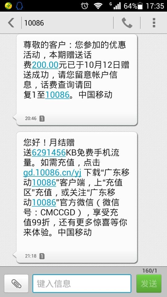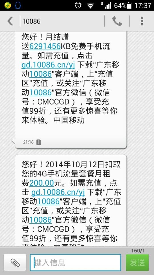 10月14日的短信:尊敬的客户:您当前帐户基本帐户余额52.27元,仅供参考。中国移动