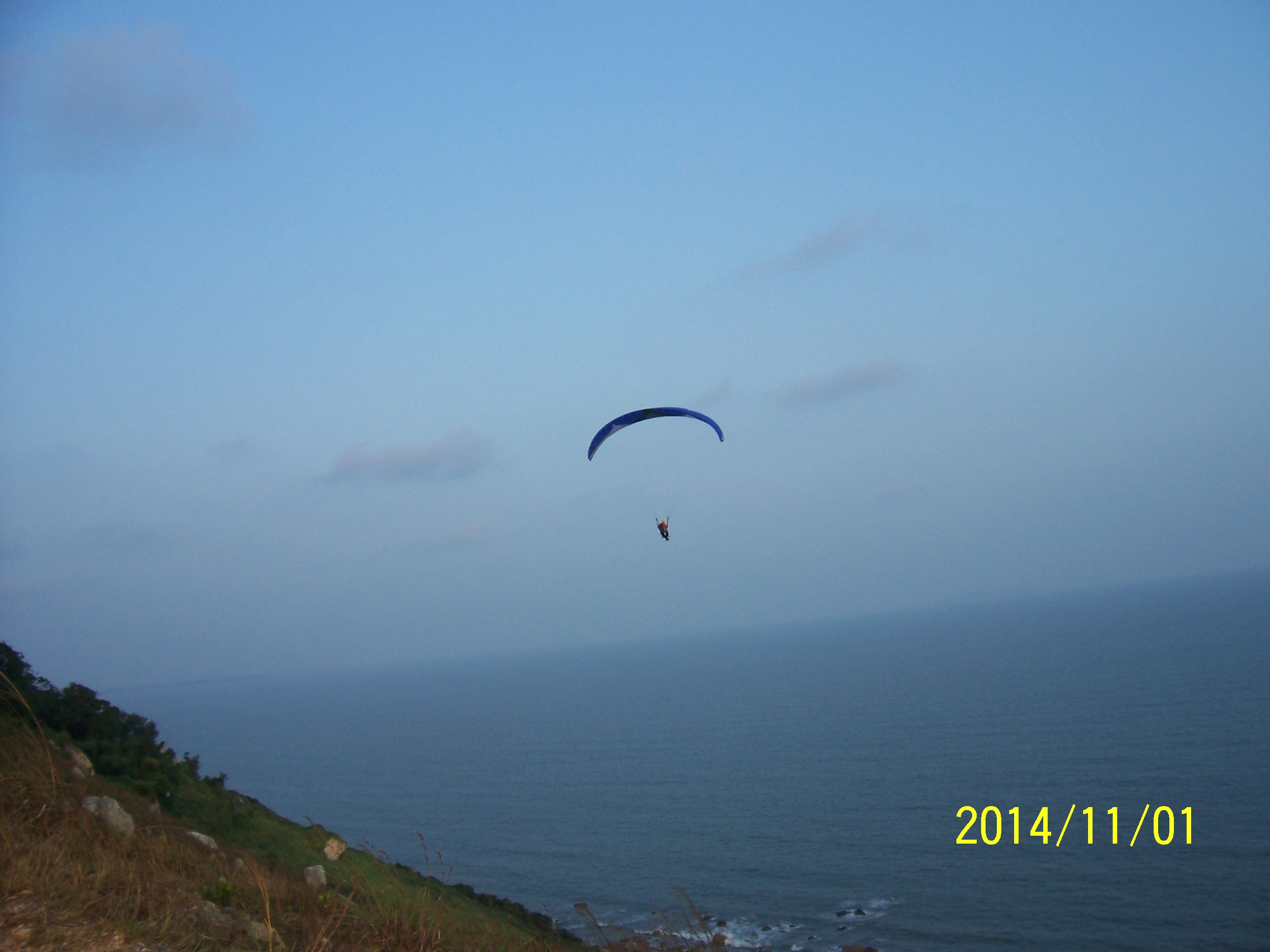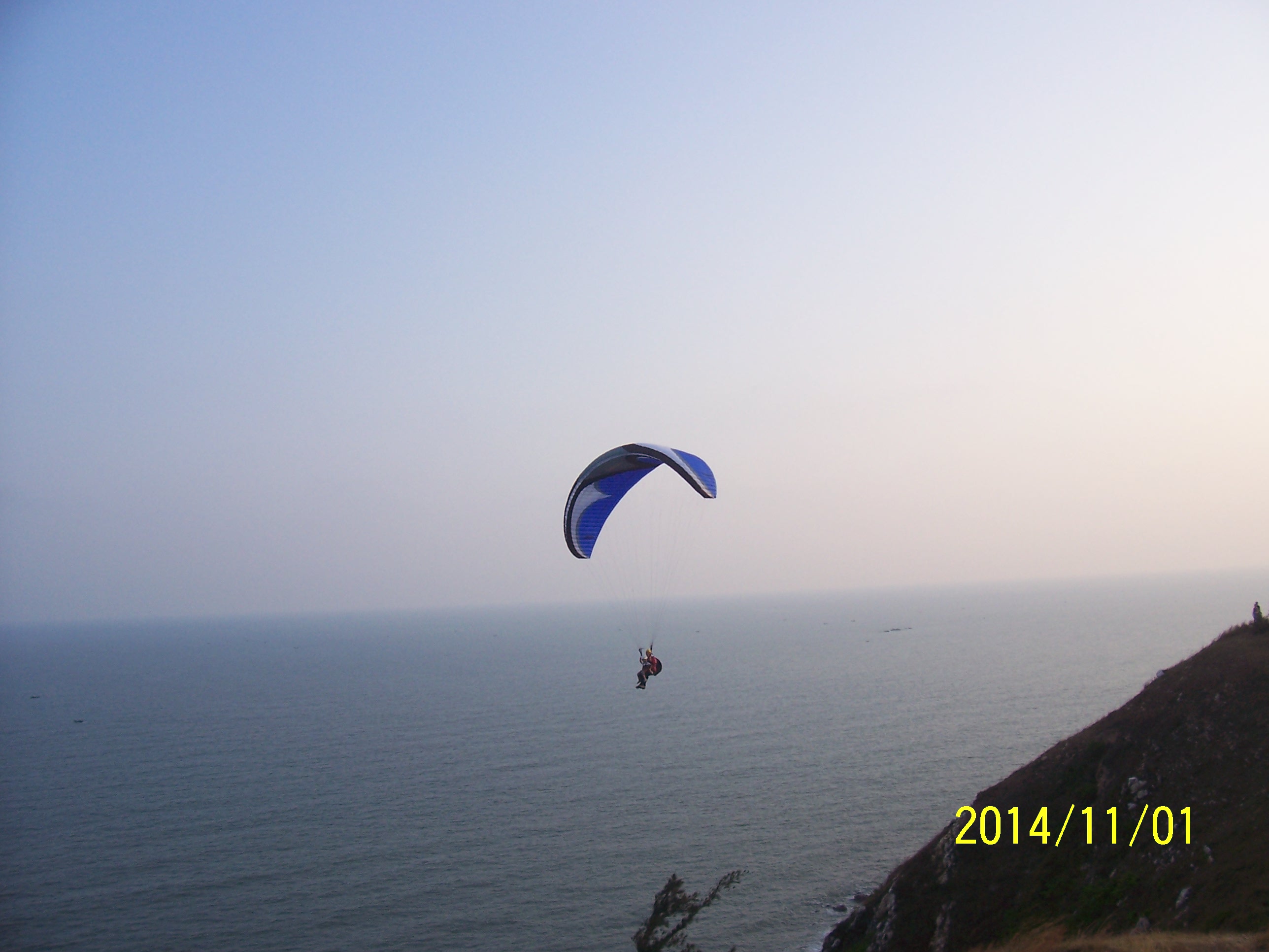 11月1日,闰九重阳,碧空如洗,海水蔚蓝,晏镜岭山上山下游人较多,有在洋人与孩子在滑翔。