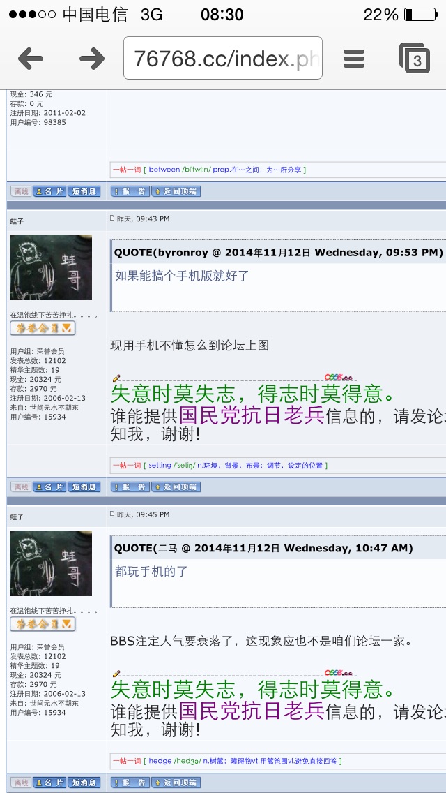 木糖醇 讲科学.破迷信.除陋习... 荣誉会员 注册 2005-07-25 消息 5,900 反馈评分 1 点数 61 年龄 37 2014-11-14 #16 QUOTE(蛙子 @ 2014年11月10日 Monday, 12:04 AM) 水区大势已去,已再难复昨日辉煌。 [snapback]3714568[/snapback] 、手机浏览器可以上论坛,只是宽度问题。 可以让坛主搞手机适配的。