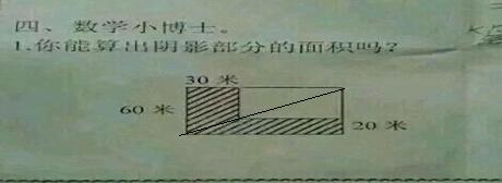QUOTE(莫言 @ 2014年12月02日 Tuesday, 01:49 PM) 有想过你假设的X可以无限加长的吗?为什么算出来是60?我加长至1000米也可以的,并不会改变图中60、30、20这几个数据。 [snapback]3719421[/snapback] 你能按你的说法画出这样图吗?加长至1000米也可以.但就是另一个图形面积,和本题阴影面积不同了,想想吧