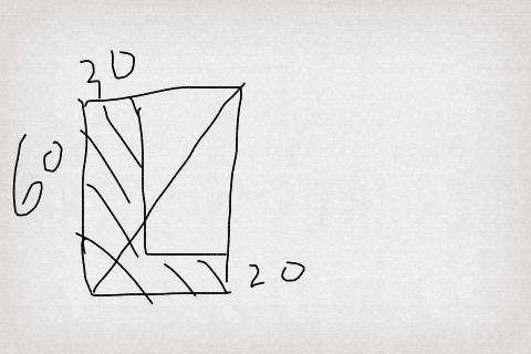 建立直角坐标系分别做两条线段连接白色矩形对角线,和阴影部分的对角线,可以发现他们是平行的,然后根据斜率k相等可以得出一个方程组(40+20)✘(-x)=40✘(-30-x)解得x等于60,所以长边的为90米,答案出来了,90✘20+40✘30等于3000