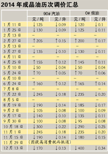 而在该通知发出后不久,市场预期的成品油降价靴子也终于“落地”。国家发改委发布通知,按现行成品油价格形成机制测算,汽、柴油价格每吨可分别降低670元和640元。但根据财政部、国家税务总局[微博]的通知,自12月13日零时起汽、柴油消费税单位税额每升分别提高0.28元和0.16元,折合每吨影响汽、柴油价格分别少降500元和240元。两个因素相抵,国内汽、柴油价格每吨分别降低170元和400元。汽柴油价格的降幅也因此大幅缩水。