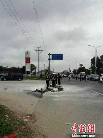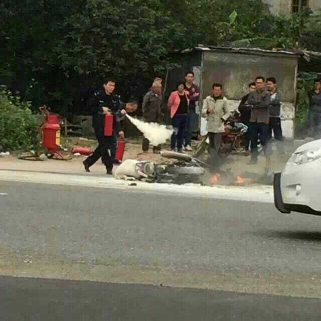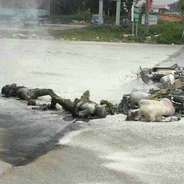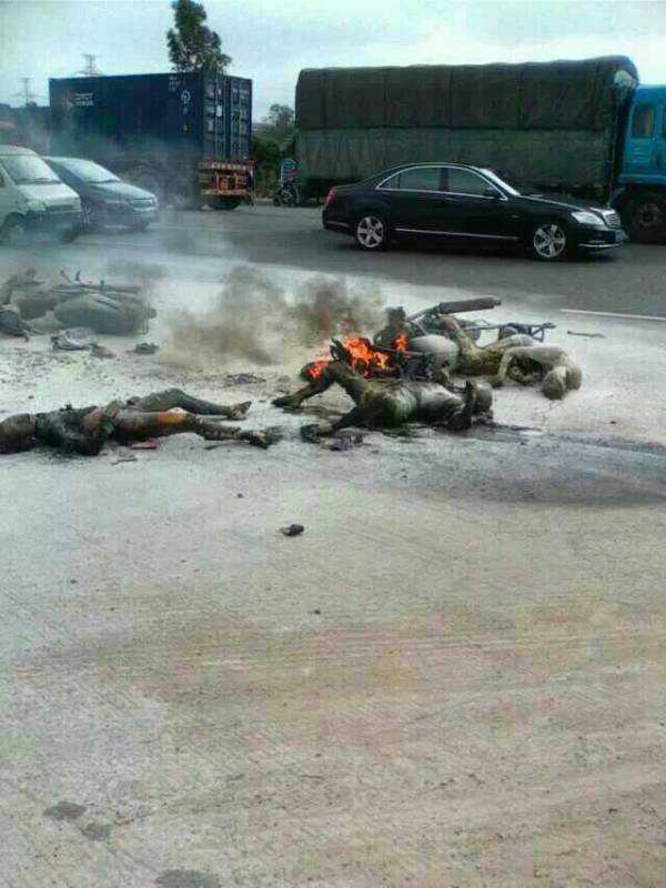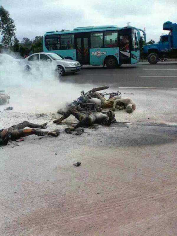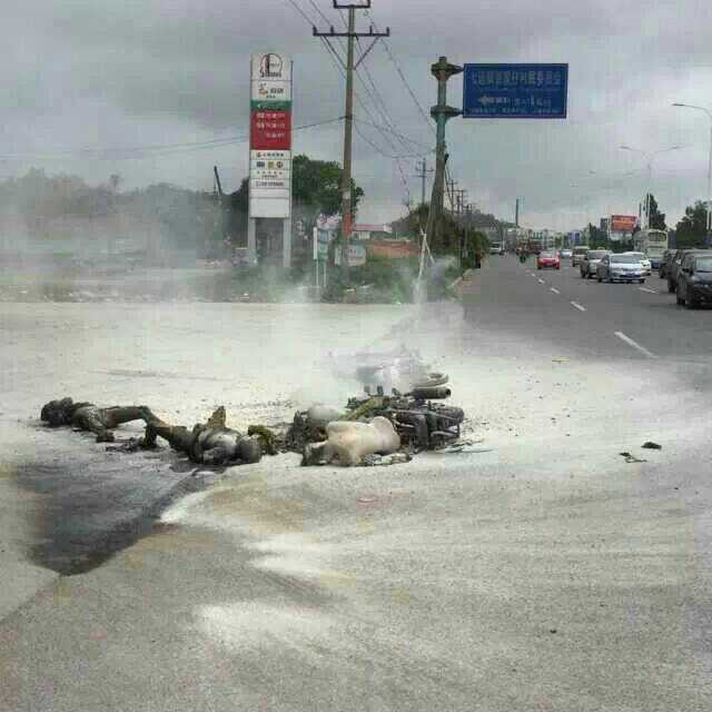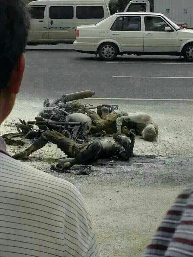 刚从高水路经过,在乙烯厂旁的中石化加油站(不是乙烯加油站)边的路口,两辆摩托车被火烧成铁架,旁边还有两具烧焦的尸体,大批警察在维持现场,消防灭火的泡沫洒落一地。