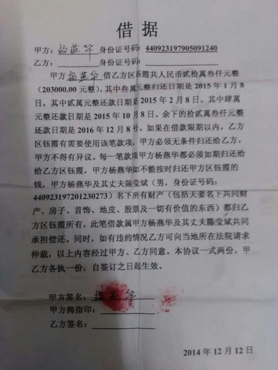我与电城镇河望陈屋村陈莹斌夫妇本是朋友,本人捧着一片好心好意,借与陈莹斌夫妇二十几万用于生意周转,到头来掉进陈莹斌夫妇设计的陷阱里。陈莹斌的老婆叫做杨燕华,在电城市场二楼经营童装,兼裁剪各式各样的袋子零售以及批发。在2014年12月12日当天,杨燕华找到我说,年底要大进货,家里刚盖了楼房(四层高,很漂亮),手头比较紧,急需资金周转,同时还想扩大生意,兼做皮袋生意。出于对陈莹斌夫妇的友情,基于对一个机关单位的工作人员的信赖(陈莹斌在爵山水站农村信用社上班),本人真心实意帮助朋友,借给了杨燕华二十万零三千元整。当时杨燕华承诺分四个阶段归还。等到了还款日期,杨燕华以各种各样的借口推脱不肯归还借款,,我唯有寻求法律途径解决,与陈莹斌夫妇法庭相见。意想不到的是,陈莹斌一个受过高等教育的党员,竟然从头到尾给我设计一个骗局。开庭当天,杨燕华不到场,,陈莹斌说是她失踪了,并且利用手中权势勾结村委出示失踪证明;更让我觉得可恨的是,陈莹斌说夫妻感情不和,正在闹离婚。因为当时写借据的时候,杨燕华说陈莹斌在外地办事,借据只登记了杨燕华的名字以及打了她的手指印,但是借据中有说明此笔债务由陈莹斌夫妇共同偿还。当初找我借钱的时候,没有任何感情不好的消息,现在需要还钱反而说是夫妻感情不好闹离婚。我如期索回相关借款时,杨燕华经营的服装店立即转让了。平常时候,陈莹斌都会去店里帮忙料理生意,出双入对;节假日的时候,俩夫妇还带着儿子在公园吃麦肯基,喝茶及到电城北门头政府门口散步。如此恩爱的夫妻,现在为了躲避偿还所借款项,竟然睁大眼睛说瞎话,还到村委会开具杨燕华失踪证明。杨燕华前几天都还跟我联系,让我给她五年的时间,让她到时候挣到钱再还给我。大家都评评理,你们说陈莹斌夫妇这是唱的哪一出戏?