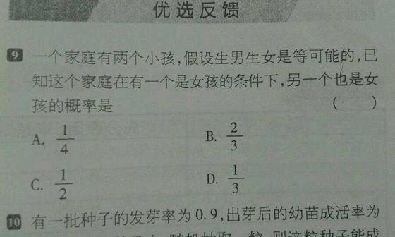 又因为已经知道其中的一个是女孩,所以这是“条件概率”,具体怎么算请参考高中数学的概率知识。