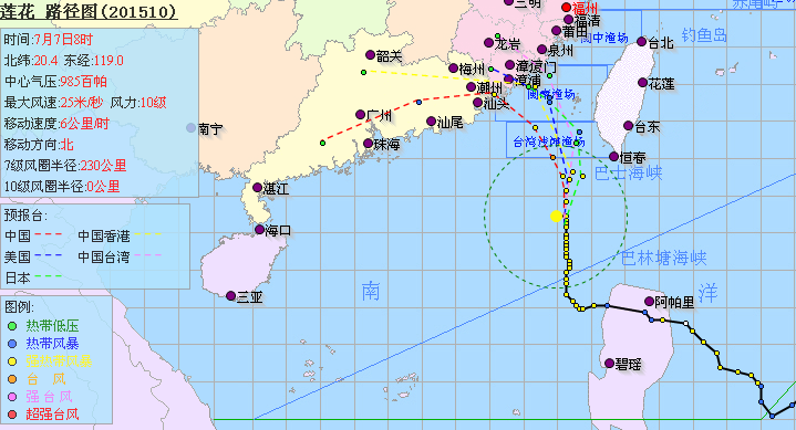 [attachmentid=341887] [attachmentid=341888] 时间:7月7日8时 北纬:20.4 东经:119.0 中心气压:985百帕 最大风速:25米/秒 风力:10级 移动速度:6公里/时 移动方向:北 7级风圈半径:230公里 10级风圈半径:0公里