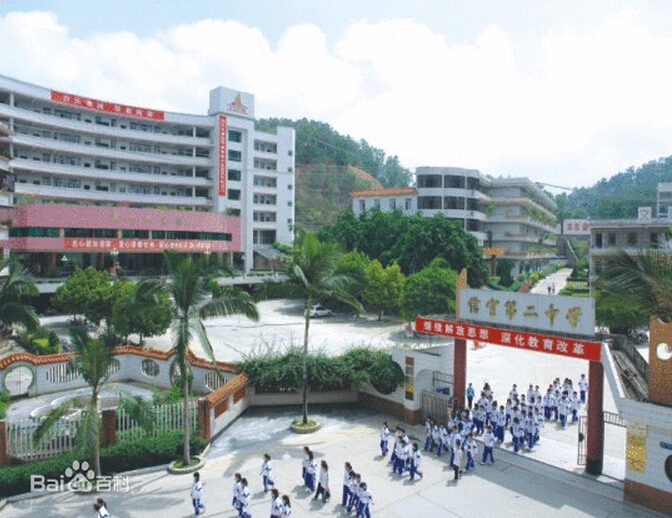 信宜市第二中学创建于一九七八年,从有历史记载到现在,二中已有30年的历史,是信宜市最早的中学之一。学校坐落在美丽的锦江河畔,背靠梅岗,远眺锦水。集天地之精华,汇山水之灵秀,英才辈出于此圣雅之地。