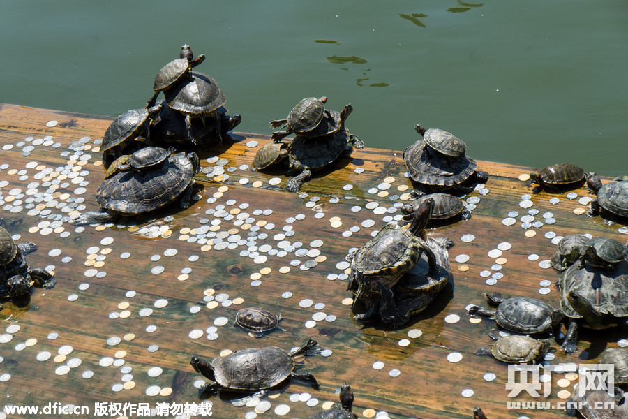 2015年8月1日,福建厦门,南普陀寺前池塘内乌龟“龟满为患”,成群乌龟叠罗汉晒太阳。寺庙打出:“水池已满,请勿放生”的告示,提请市民不要再向水池内放生。目测水池内乌龟数以百计,在一块一米见方的木板上,盘踞着数十只大小乌龟,乌龟们甚至叠起了罗汉,悠闲地晒着太阳。