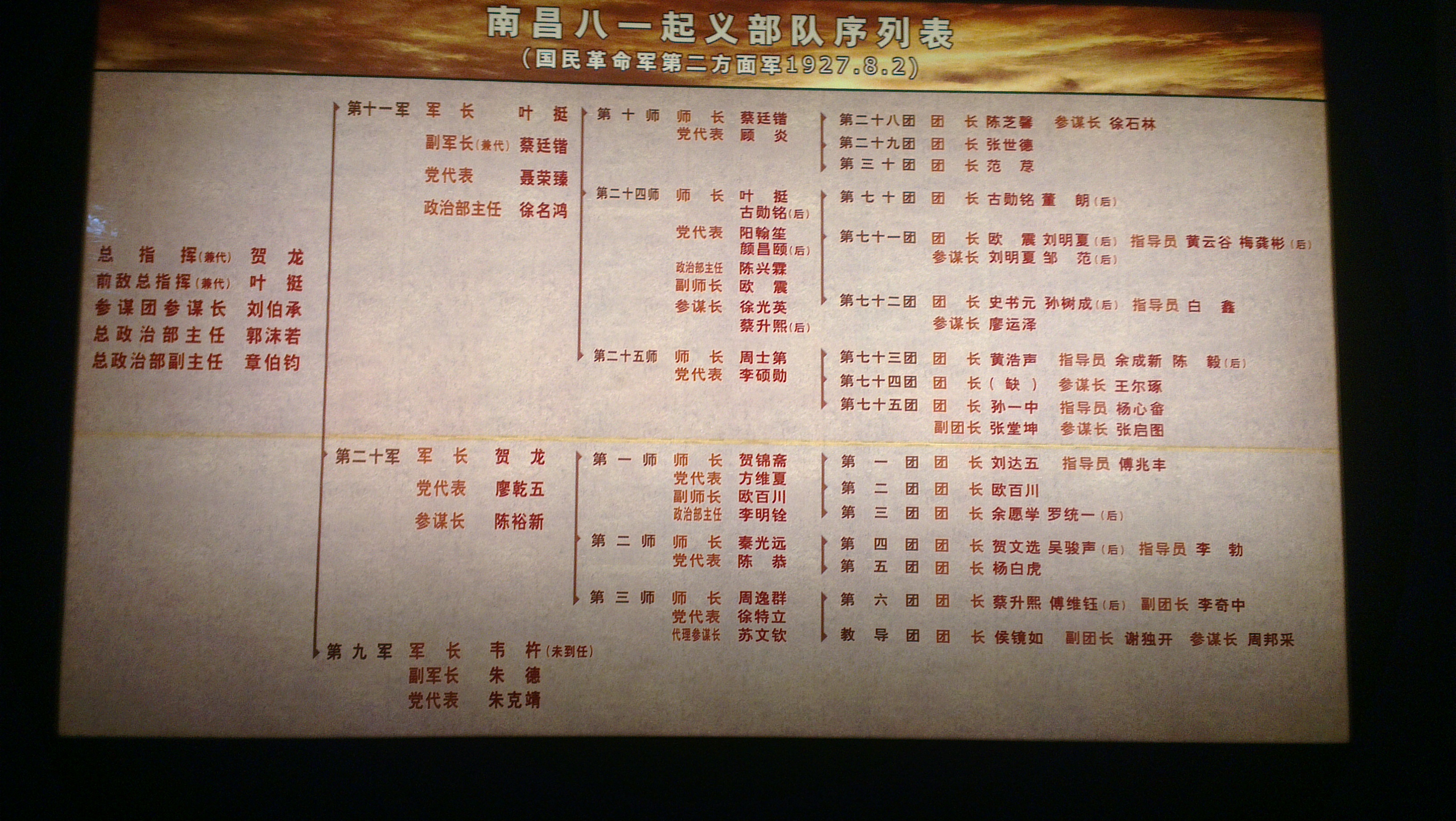 这个序列表显示郭沫若也是南昌起义军领导人之一。还注意到周士第的资历挺老的,南昌起义时就已经是师长。而这时陈毅也才是团级干部,林彪这时只是连长。(他俩都没能在第一时间赶上起义军),而后来周士第竟然没有被评到开国大将,只评到开国上将。
