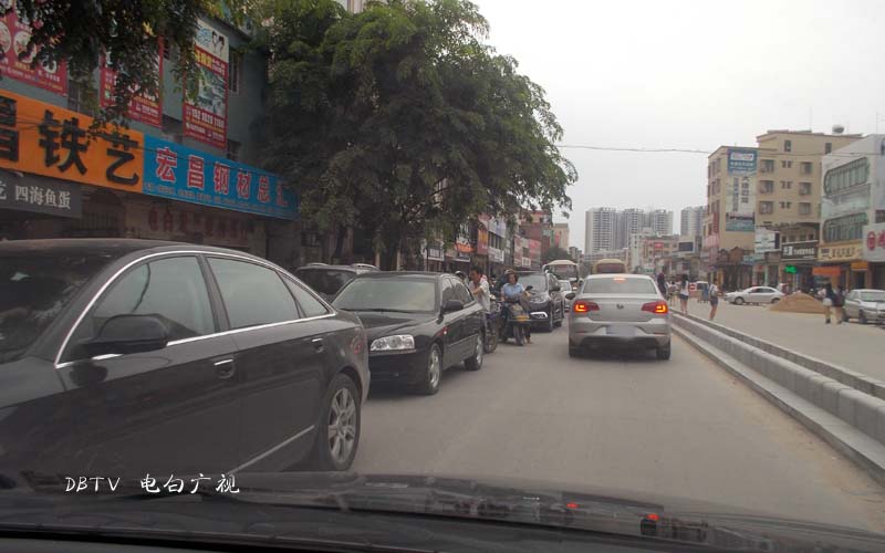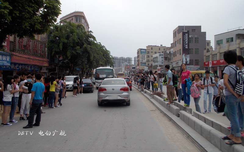 在茂一职门口,由于是周五,小编看到很多学生在路边等车,也有很多人走向三角圩车站,中巴车停在路边,交通比较阻塞。