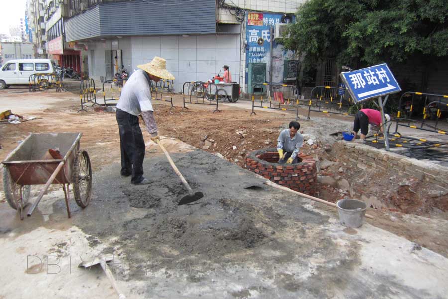 底层混凝土铺设工作:西面剩余强记门口到一运门口未铺设(大概50米),东面剩余公路局门口到二运门口未铺设(大概100米)。稳定层未铺设的路段与底层混凝土未铺设路段一致。