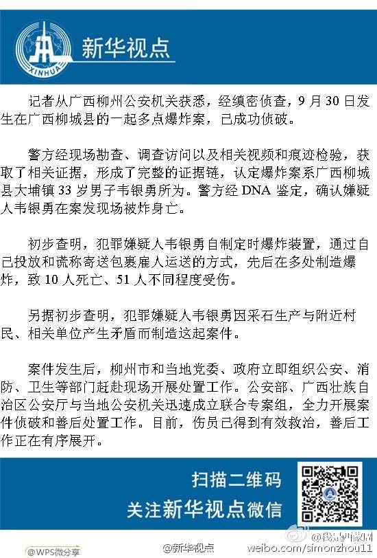 据新华社电 广西柳城县警方通报,9月30日在柳城县发生的17起包裹爆炸事件已致7人死亡,已排除暴恐案件的可能性,犯罪嫌疑人身份已确定。